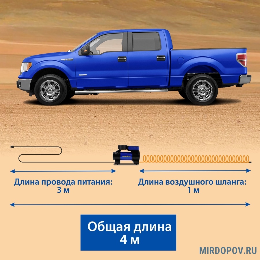 Цифровой компрессор Goodyear может беспрерывно работать в течение 30 минут. Встроенный LED-фонарь позволяет продолжать работу даже в условиях недостаточной освещенности.