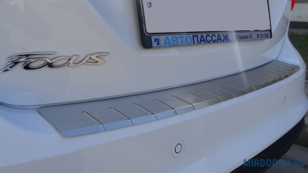 Накладка на задний бампер с загибом выполнена ИНДИВИДУАЛЬНО для Форд Фокус 3 из высоколегированной нержавеющей стали от Германского производителя марки KRUPP