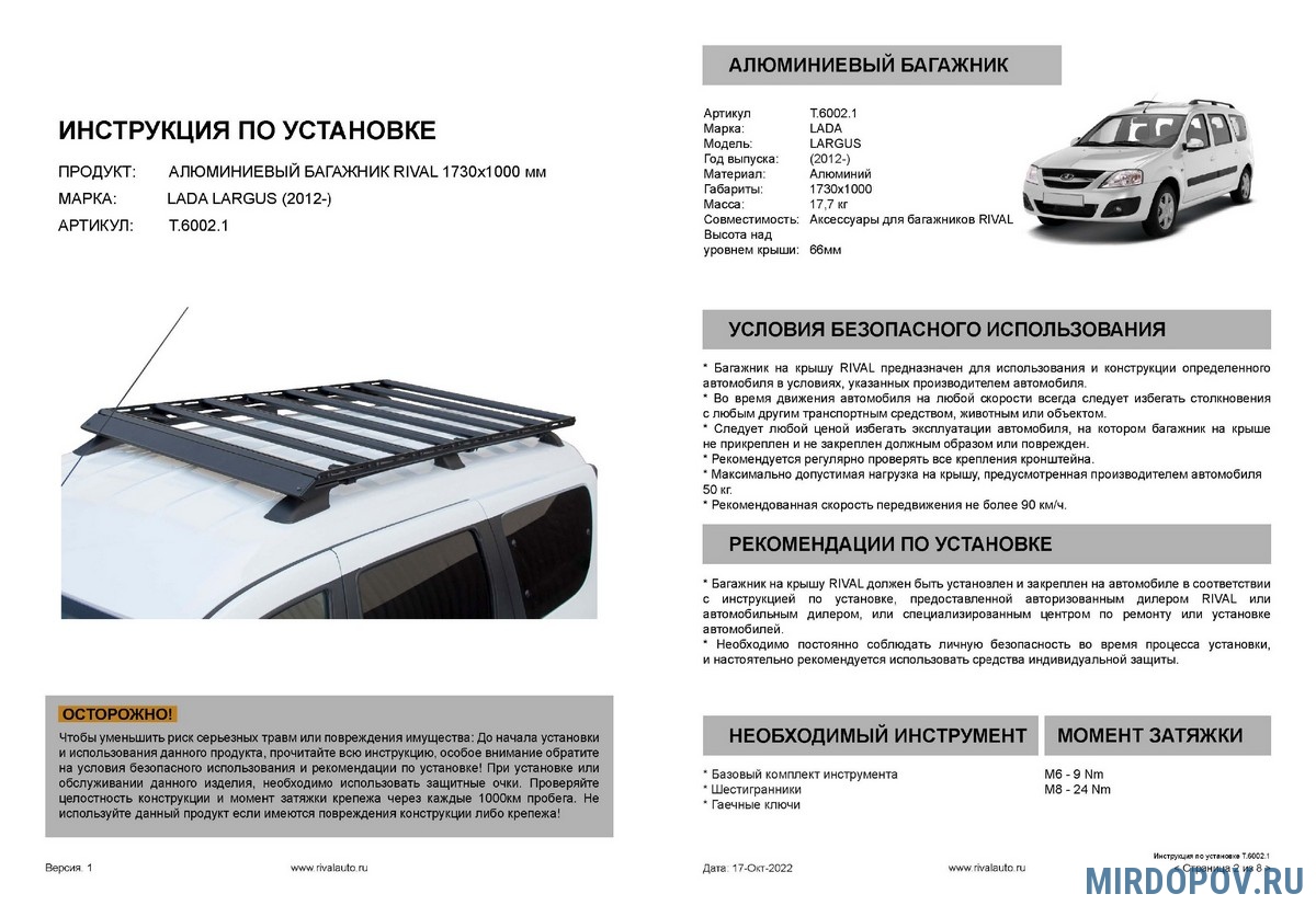 Багажник на крышу алюминиевый Rival для Lada Largus (2012-2025) № T.6002.1