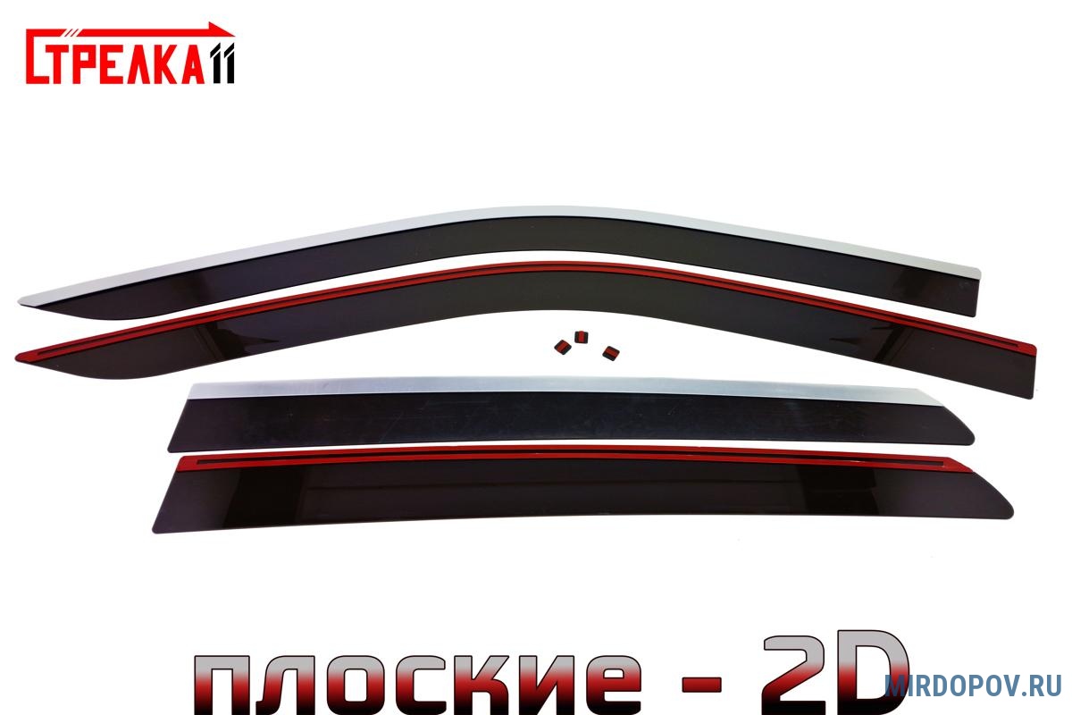 Аэродинамические дефлекторы боковых окон 2D – продукция ведущего российского производителя аксессуаров для автомобилей – компании «Стрелка11». Ветровики отличаются эргономичностью, высокими эксплуатационными характеристиками, долговечностью. Это модельные аксессуары, благодаря чему идеально подходят конкретной марке автомобиля – с тыльной и фронтальной стороны остаются незаметными.