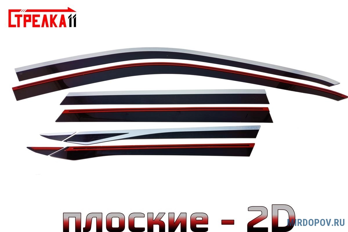 Аэродинамические дефлекторы боковых окон 2D – продукция ведущего российского производителя аксессуаров для автомобилей – компании «Стрелка11». Ветровики отличаются эргономичностью, высокими эксплуатационными характеристиками, долговечностью. Это модельные аксессуары, благодаря чему идеально подходят конкретной марке автомобиля – с тыльной и фронтальной стороны остаются незаметными.