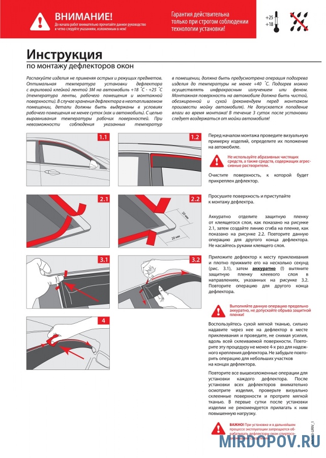 - Дефлекторы крепятся с помощью двусторонней монтажной ленты производства компании «3М» шириной 8 мм.