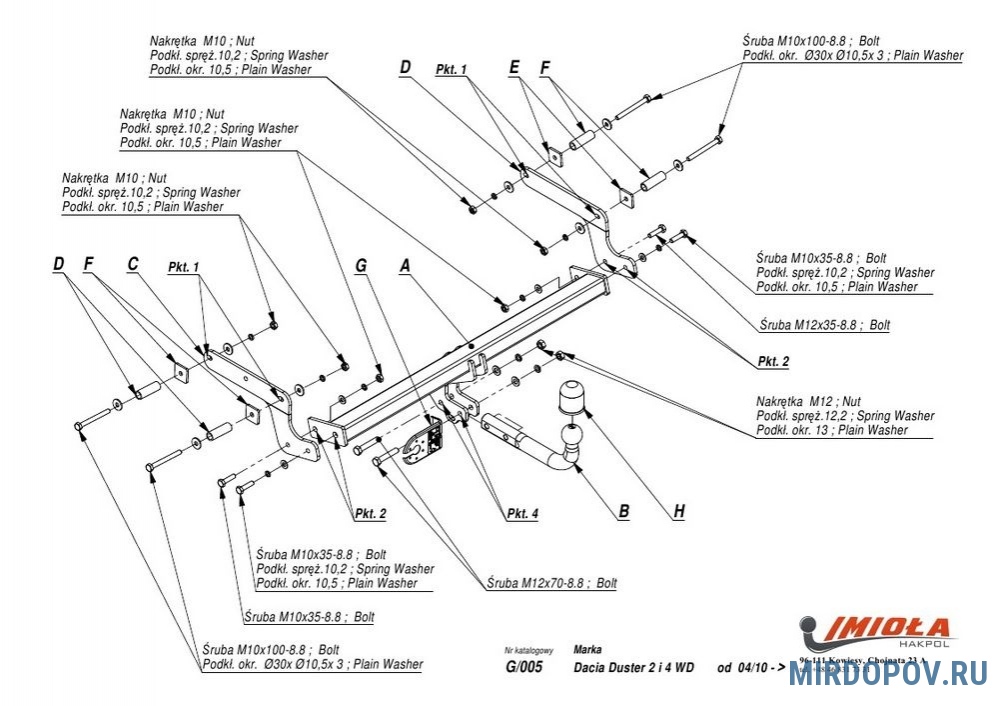 Польская компания IMIOLA-HAKPOL была основана в 1991 г. Специализируется на производстве фаркопов (тягово-сцепных устройств) для более чем 700 моделей легковых автомобилей. На заводах IMIOLA используются только самые современные технологии производства фаркопов. Продукция обладает необходимыми европейскими сертификатами Е20 и PIMOT, а также российским и белорусским сертификатами соответствия. Продукция IMIOLA успешно продается практически во всех европейских странах и пользуется все большей популярностью. Все ТСУ сертифицированы и соответствуют ГОСТ Р 41.55 — 2005 и ТУ 4591-001-89237350-2010, диаметр сцепного шара 50мм.