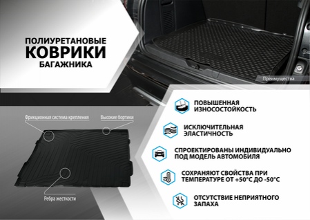 Полимерные коврики в багажник от легендарного производителя создаются с использованием модельных лекал. Это гарантирует то, что аксессуары точно повторяют контуры багажного отделения автомобиля и идеально прилегают к оригинальному покрытию. Используя такие аксессуары в багажнике машины, каждый водитель значительно увеличивает уровень защиты багажника от загрязнений. Полимерные коврики Rival обладают следующими преимуществами: