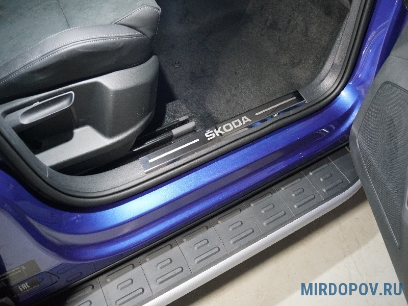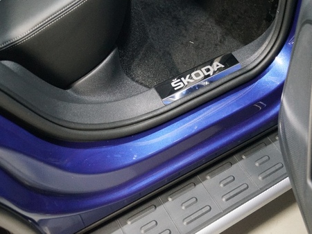 Накладки на пластиковые пороги зеркальные с надписью Skoda Karoq (2020-2025) № SKOKAR20-08