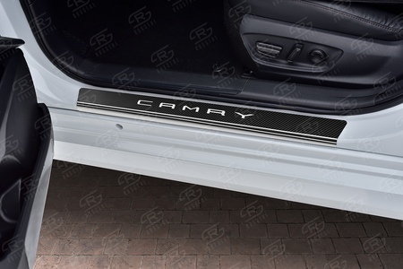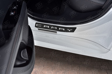 Накладки на пороги карбон с надписью RUSSTAL для Toyota Camry (2018-2024) № TOYCAM18-06