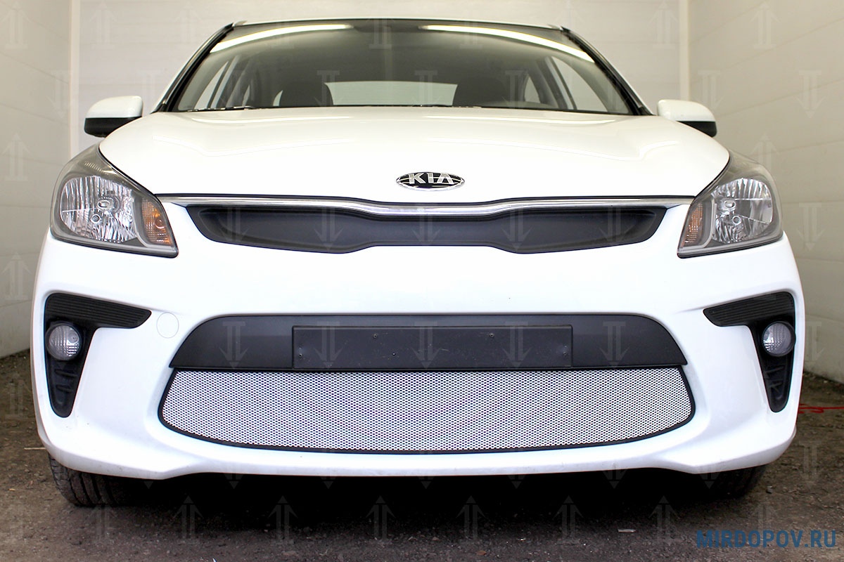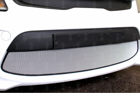 Такая защита отличается характерным рисунком. Это ромб, с диагональю 5 мм. Для изготовления стандартной защиты используется алюминий с порошково-полимерным покрытием. Для лучшей защиты от внешнего механического воздействия накладная решетка дополнительно лакируется. Толщина защитной сетки составляет 1 мм. Она крепится на специальные пластиковые Г-образные защелки. Для защиты краски кузова вокруг защитной решетки имеется специальная резиновая окантовка. Крепление проводится быстро – Г-образные элементы просто защелкиваются с обратной стороны бампера, а устойчивость всей конструкции придается саморезами. Окантовка сделана из АБС Пластика.
