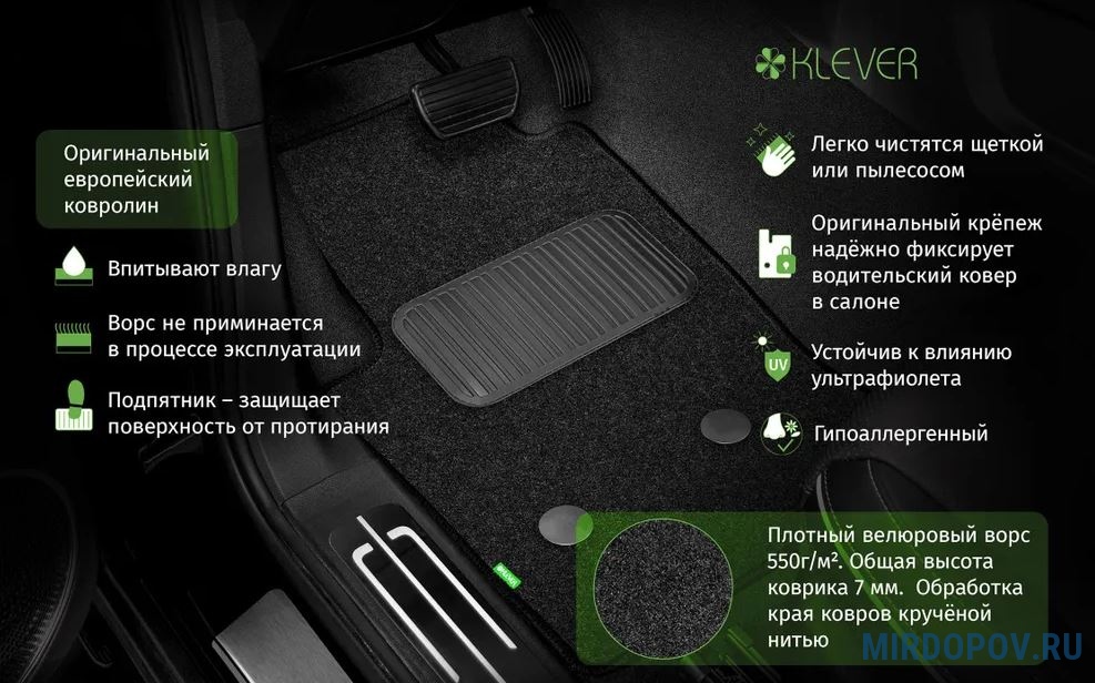 Текстильные коврики в салон Klever изготовлены из европейского автомобильного ковролина, произведенного в Нидерландах.
