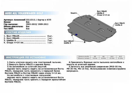 Защита картера (алюминий) Rival Audi A3 (2003-2012) № 333.0315.1