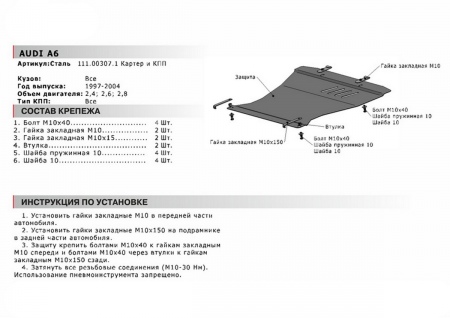 Защита картера (сталь) Автоброня для Audi A6 (1997-2004) № 111.00307.1