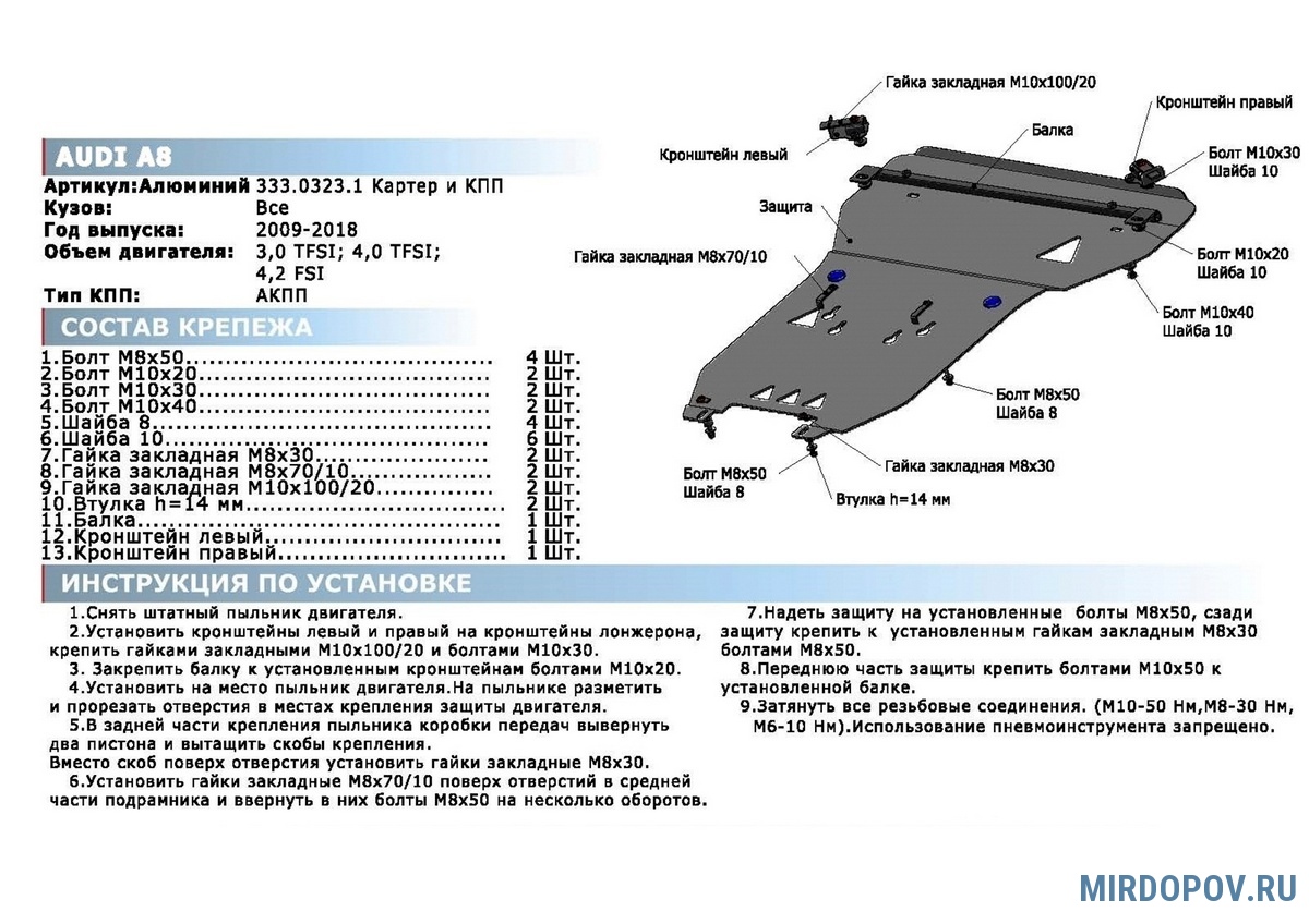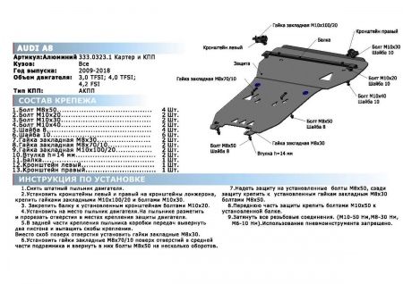 Защита картера и КПП (алюминий) Rival Audi A8 (2010-2018) № 333.0323.1