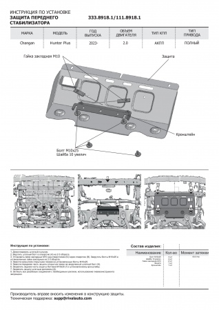 Защита переднего стабилизатора (алюминий) Rival для Changan Hunter Plus (2023-2025) № 333.8918.1