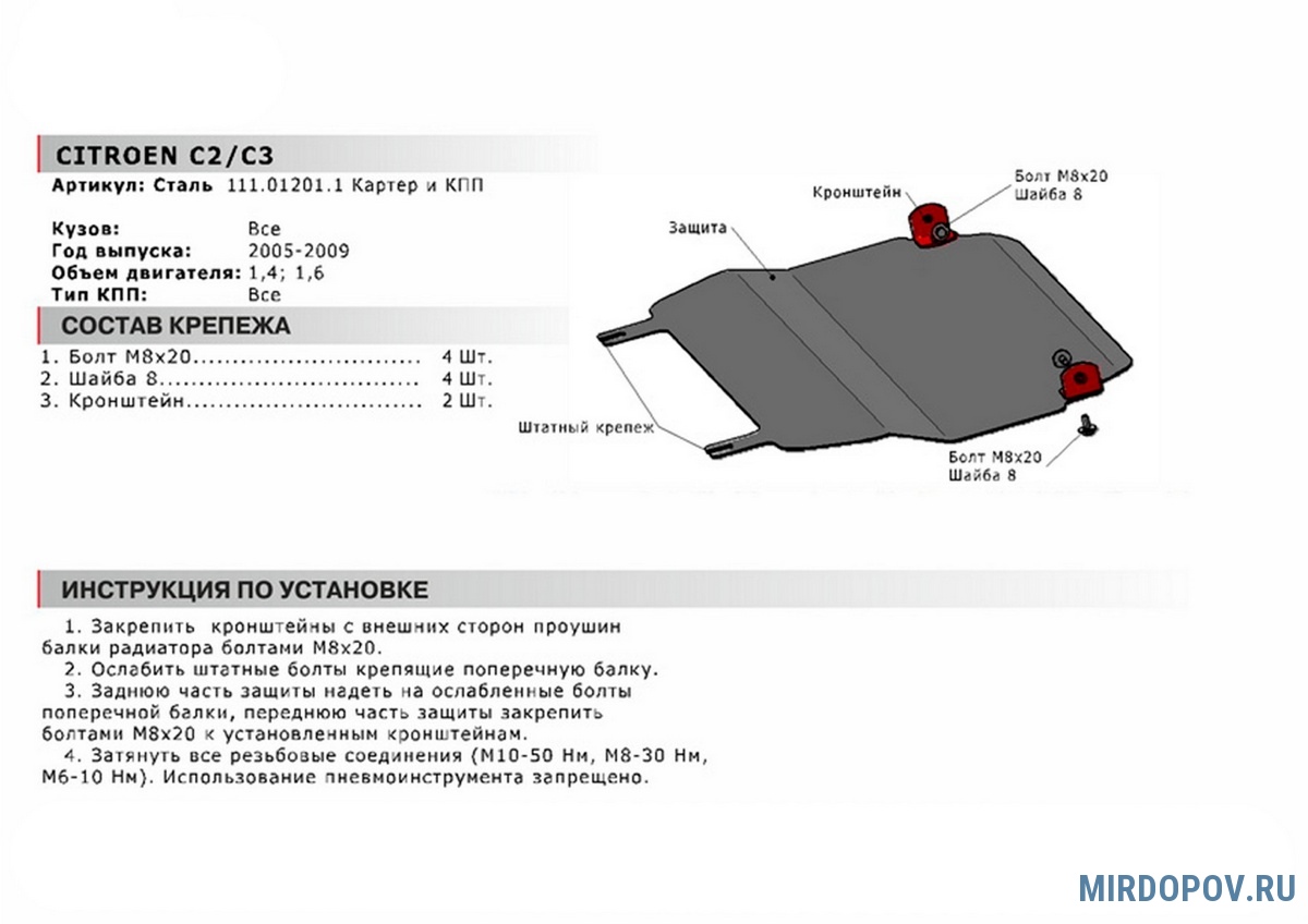 Защита картера и КПП (сталь) Автоброня для Citroen C2 (2005-2009) № 111.01201.1