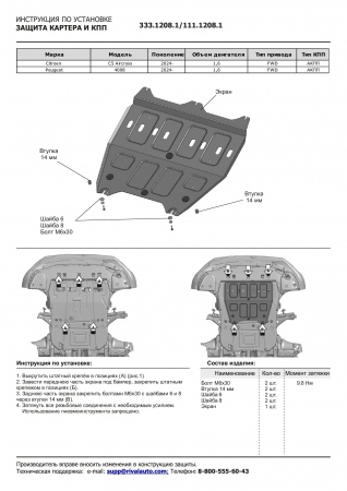 Защита картера и КПП (алюминий) Rival для Citroen C5 Aircross (2024-2025) № 333.1208.1