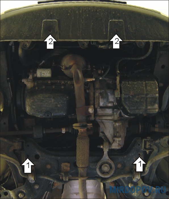 Для обеспечения безопасности передних пассажиров, производитель оставил открытыми задние точки крепления к кузову, чтобы защита не препятствовала двигателю уйти вниз, при лобовом столкновении.