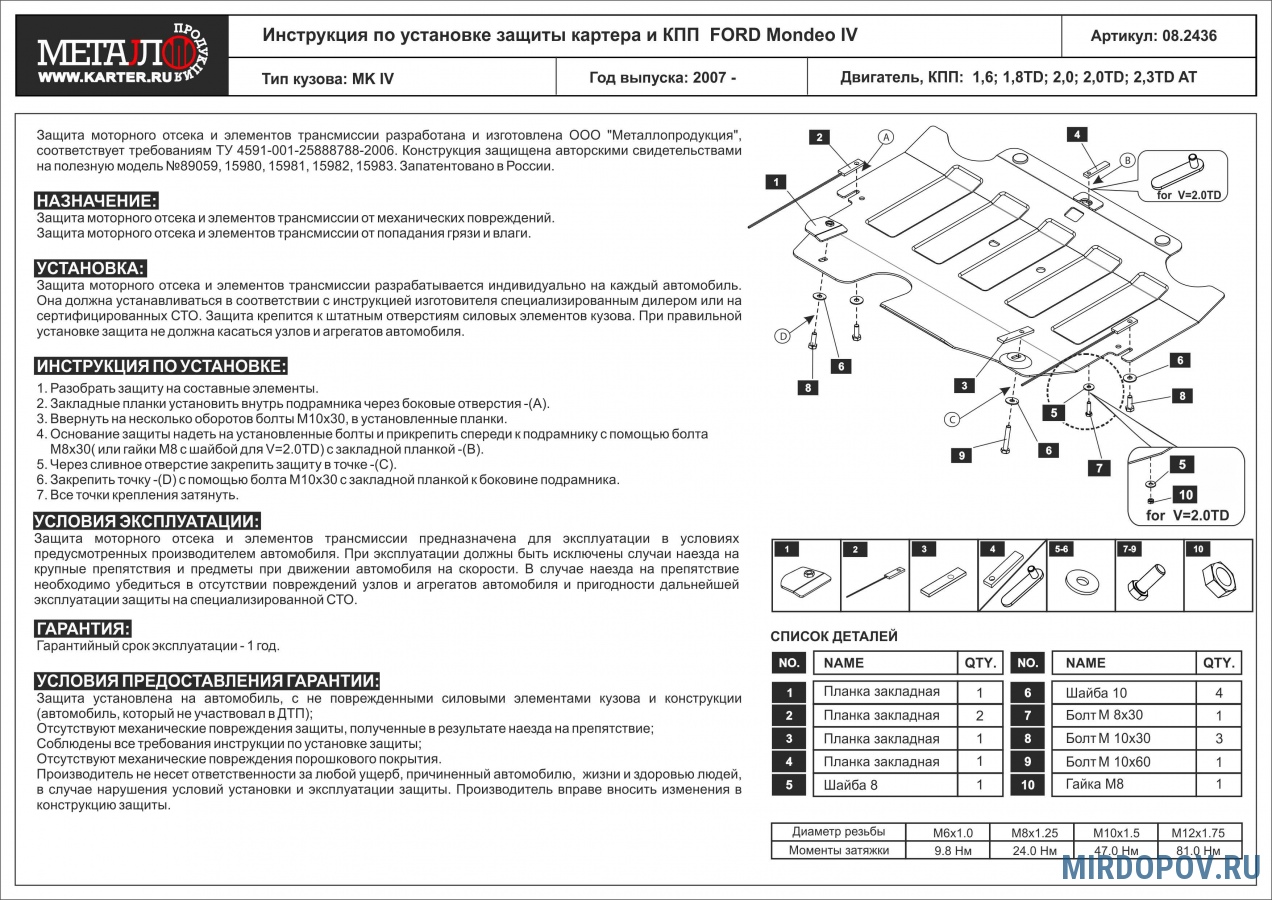 Защита картера и КПП (алюминий) Шериф для Ford Mondeo (2007-2010) № 08.2436