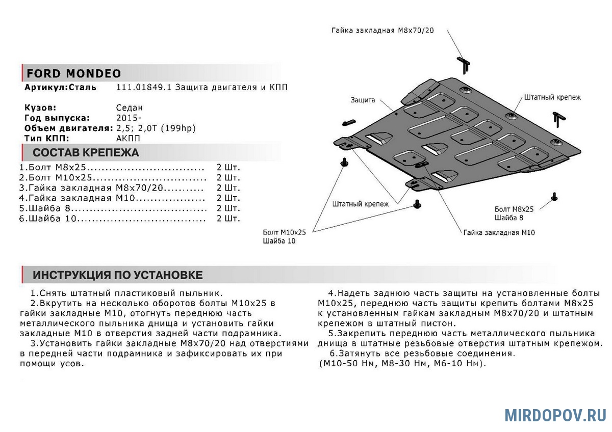 Защита картера и КПП (сталь) Автоброня для Ford Mondeo (2015-2019) № 111.01849.1