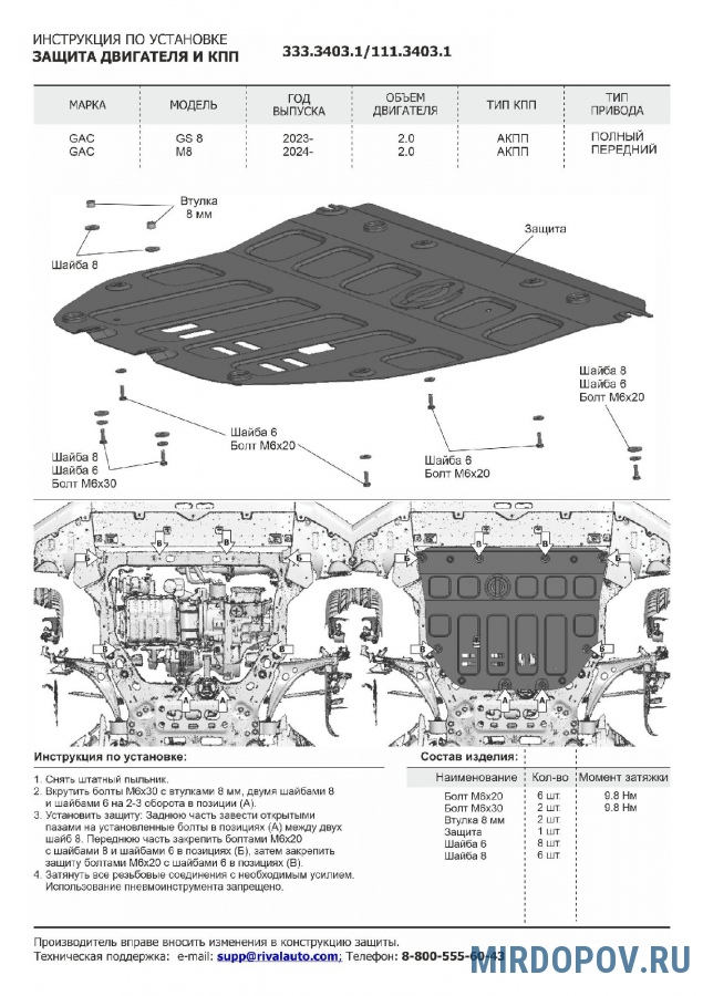 Защита картера и КПП (сталь) Rival для GAC GS8 (2023-2025) № 111.3403.1