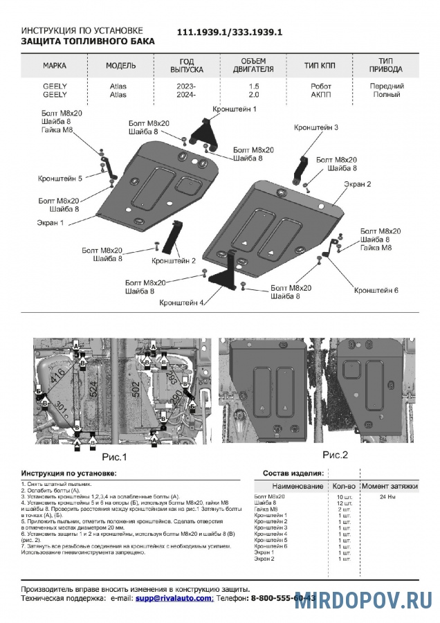 Защита топливного бака (алюминий) Rival для Geely Atlas (2023-2025) № 333.1939.1