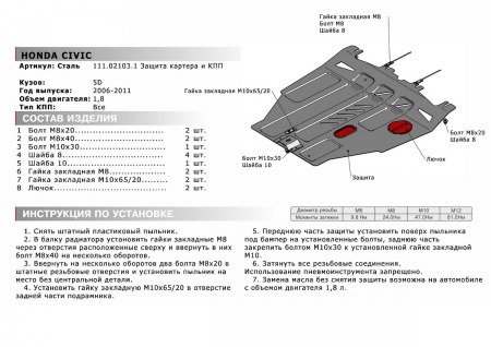 Защита картера и КПП (сталь) Автоброня для Honda Civic 5dr (2006-2012) № 111.02103.1
