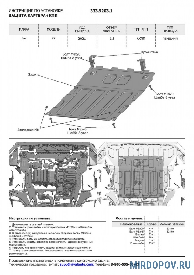 Защита картера (алюминий) Rival для Jac S7 (2020-2023) № 333.9203.1