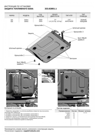 Защита топливного бака (алюминий) Rival для Kia Seltos (2020-2024) № 333.02851.1