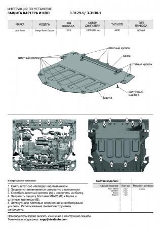 Защита картера и КПП (алюминий) Rival для Land Rover Range Rover Evoque (2019-2025) № 3.3129.1