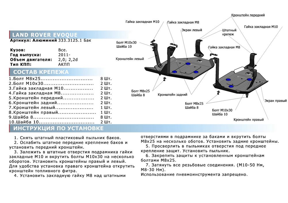Защита топливного бака (алюминий) Rival Land Rover Range Rover Evoque (2011-2019) № 333.3125.1