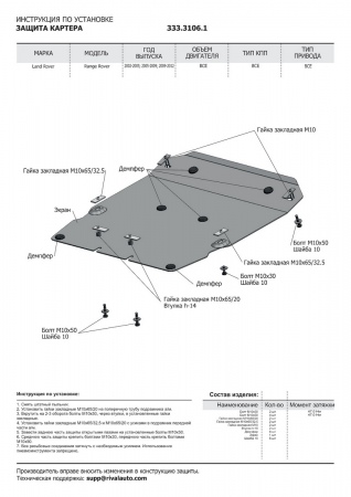 Защита картера (алюминий) Rival Land Rover Range Rover (2001-2012) № 333.3106.1