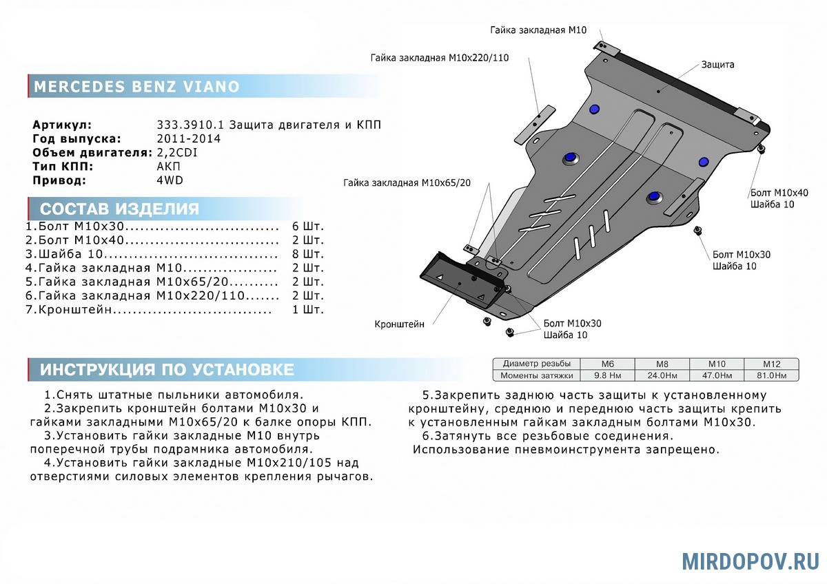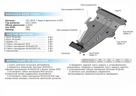 Защита картера и КПП (алюминий) Rival для Mercedes-Benz Viano (2011-2014) № 333.3910.1
