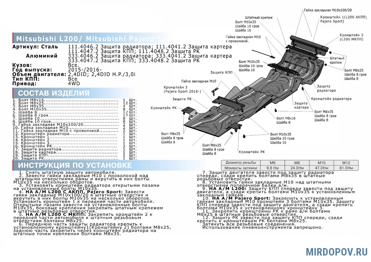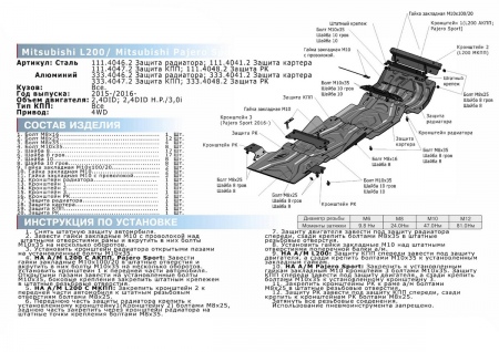 Монтаж защиты отличается простотой и не занимает много времени. Это обусловлено наличием в комплекте схемы установки, а также идеальным совпадением элементов крепежа со штатными местами и отсутствием необходимости проделывать в кузове автомобиля дополнительные отверстия.
