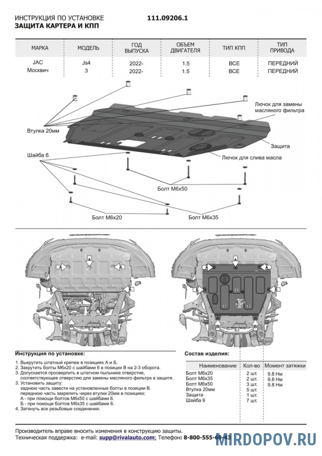 Защита картера и КПП (сталь) Автоброня для Москвич 3 (2022-2025) № 111.09206.1