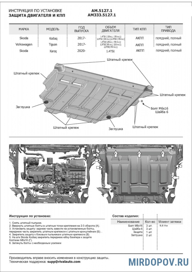 Защита картера и КПП (сталь) AutoMax для Skoda Kodiaq (2017-2021) № AM.5127.1