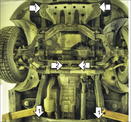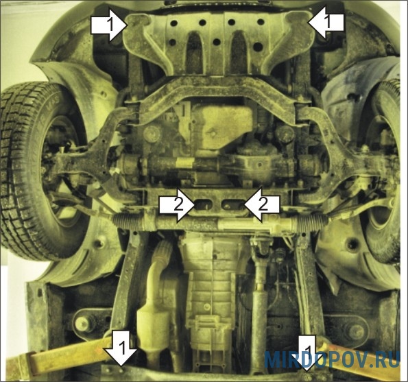 Для обеспечения безопасности передних пассажиров, производитель оставил открытыми задние точки крепления к кузову, чтобы защита не препятствовала двигателю уйти вниз, при лобовом столкновении.