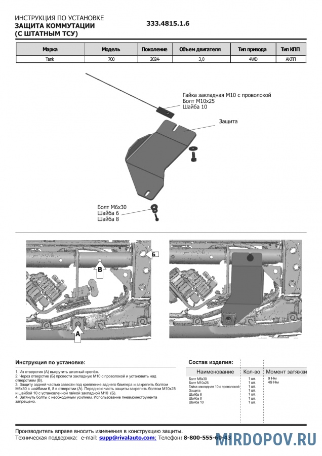 Защита коммутации (алюминий 6 мм) Rival для Tank 700 со штатным ТСУ (2024-2026) № 333.4815.1.6