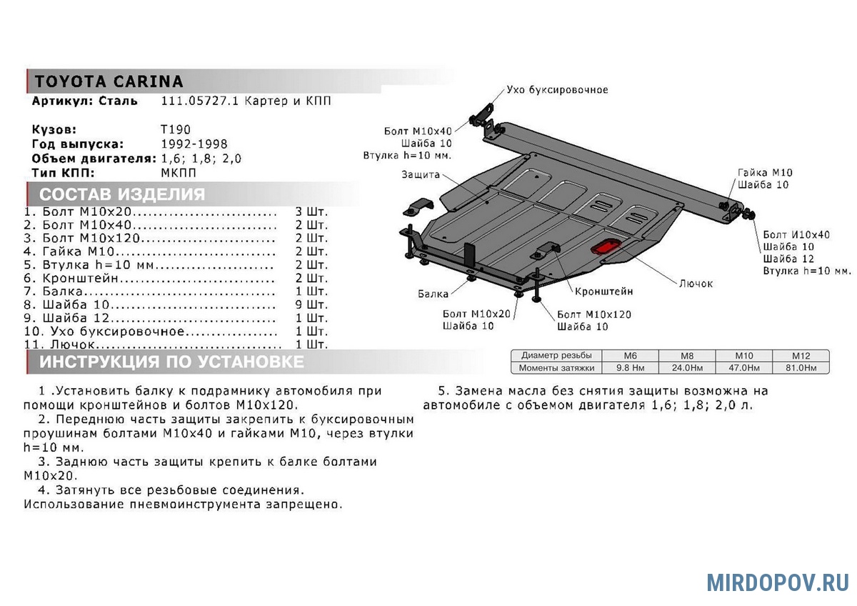 - Наличие технологических отверстий для беспрепятственной замены технических жидкостей и масел. Это позволяет сэкономить время и силы за счет отсутствия необходимости в демонтаже защиты.