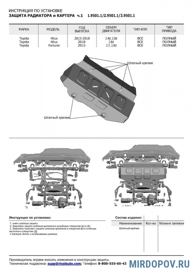 Защита радиатора и картера (алюминий) Rival Toyota Fortuner (2017-2025) часть 1 № 3.9501.1