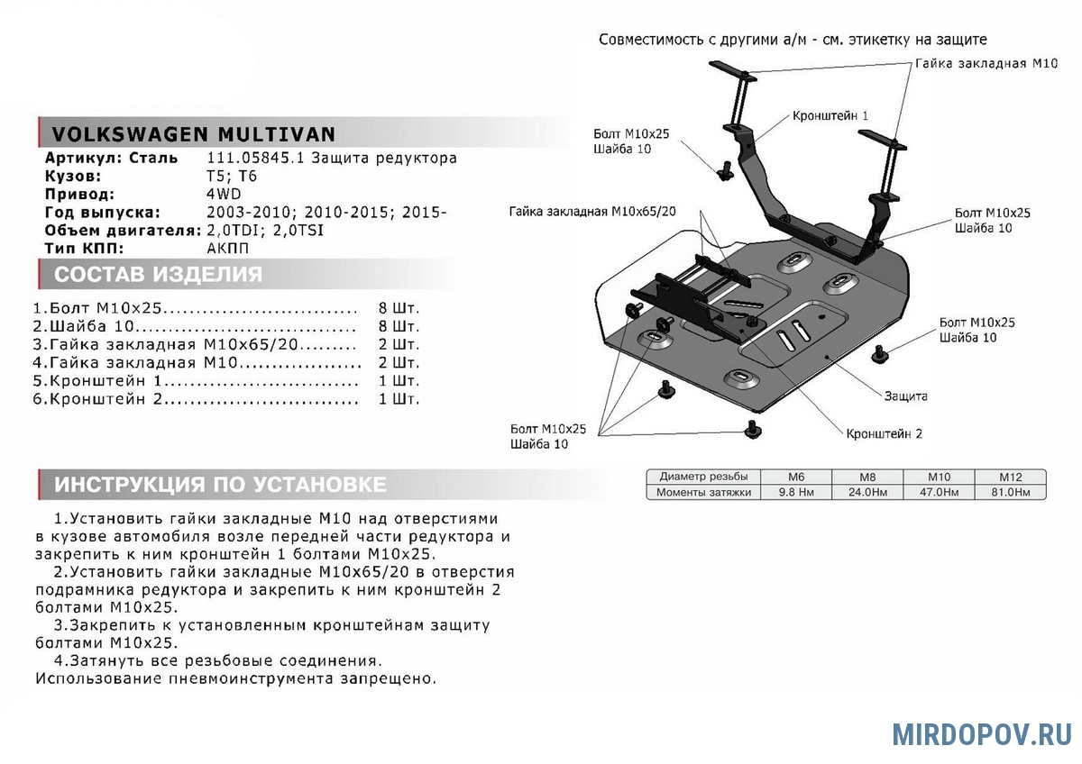 - Простая установка, что обусловлено совпадением элементов крепежа со штатными отверстиями.