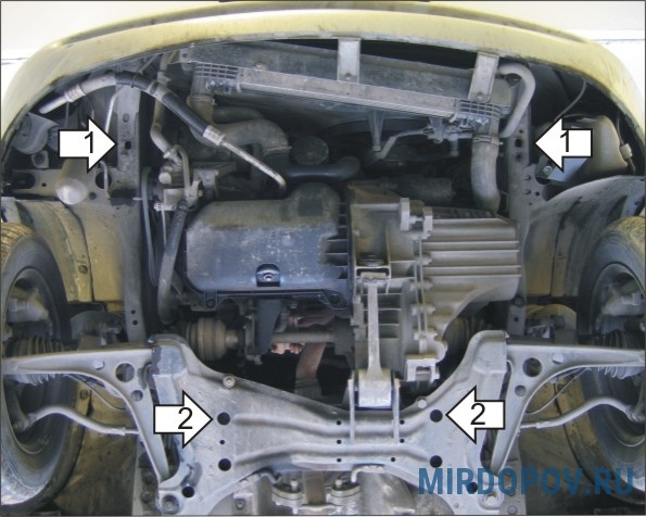 Для обеспечения безопасности передних пассажиров, производитель оставил открытыми задние точки крепления к кузову, чтобы защита не препятствовала двигателю уйти вниз, при лобовом столкновении.