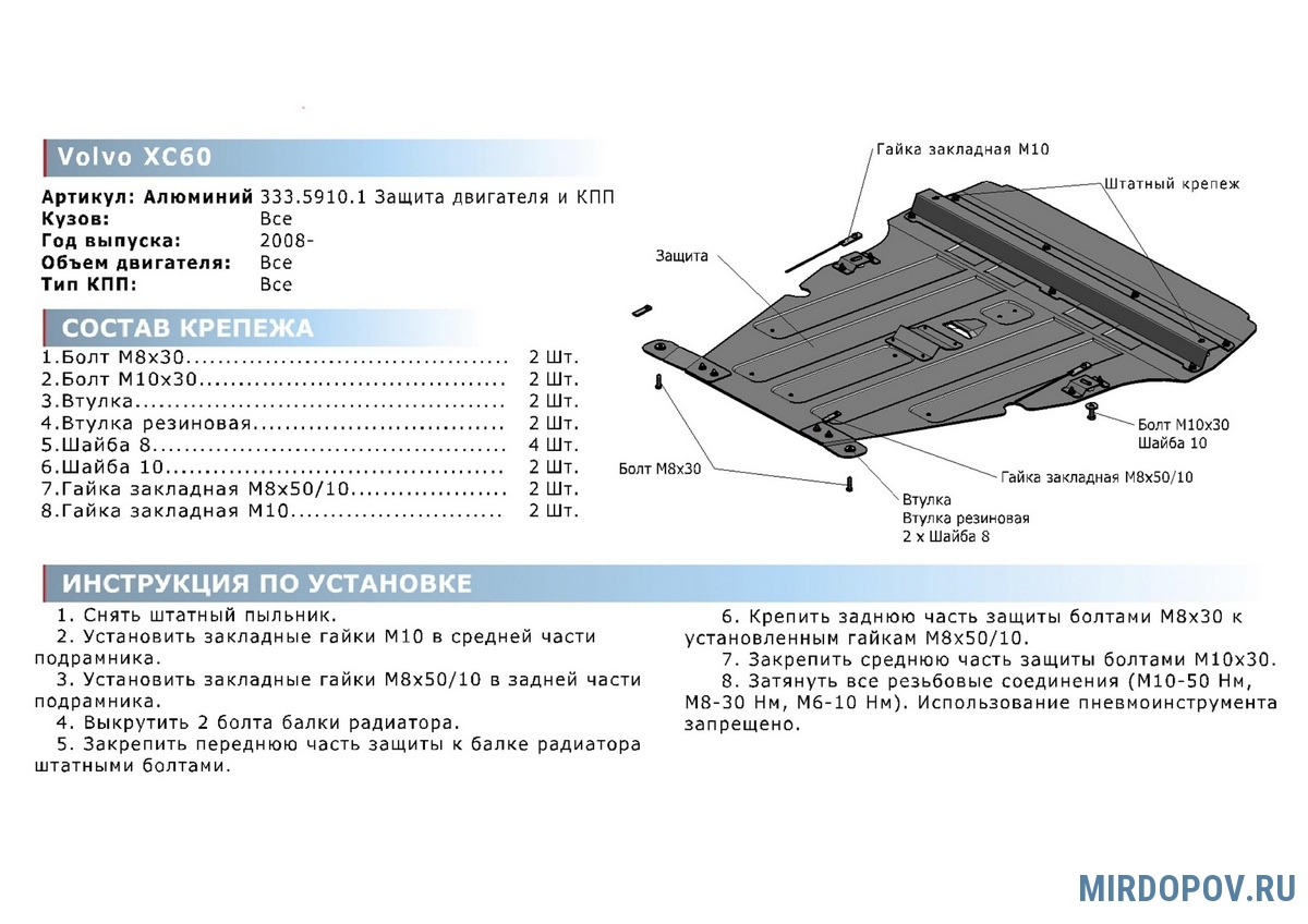 Защита картера и КПП (алюминий) Rival Volvo XC60 (2008-2017) № 333.5910.1