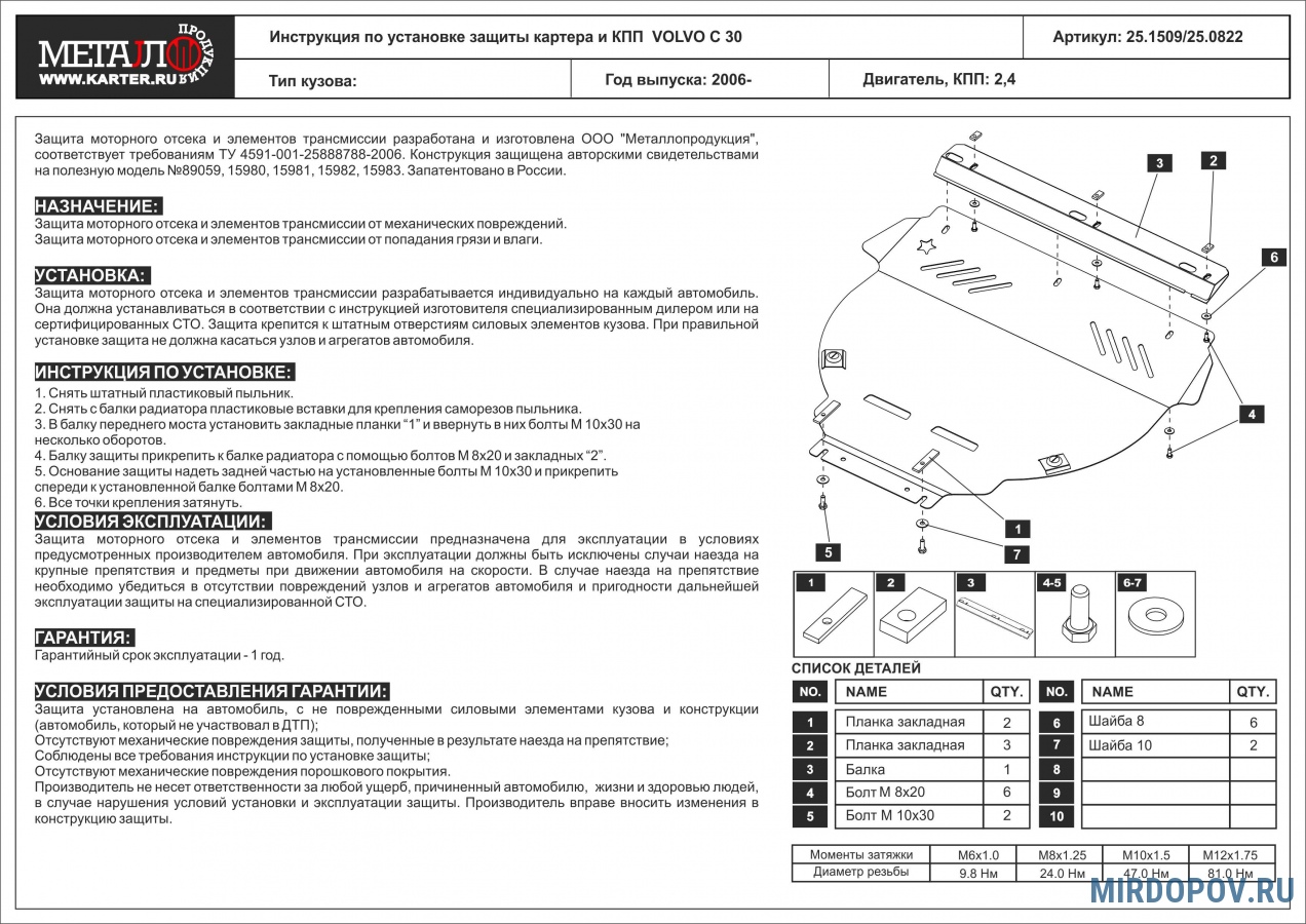 Защита картера и КПП (алюминий) Шериф для Volvo V50 (2004-2012) № 25.0822