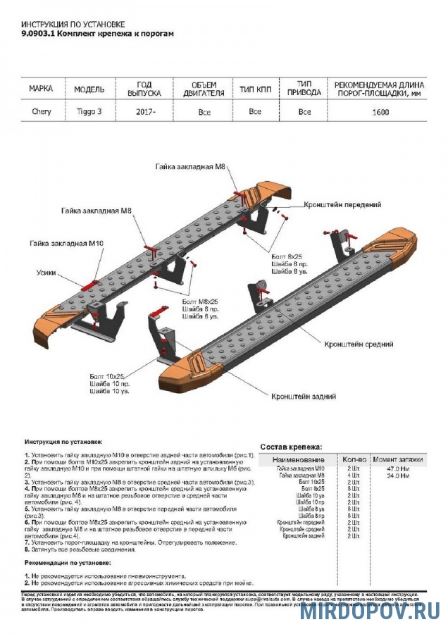 - Простота установки за счет точного совпадения штатных отверстий с элементами крепежа защиты.
