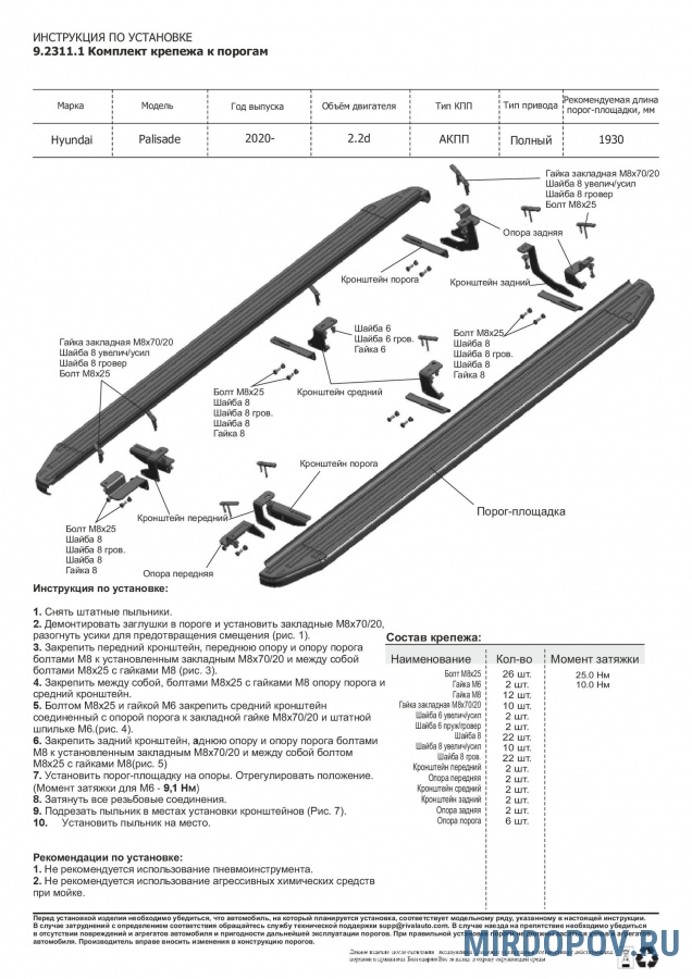 | Установка порогов (комплект) | от 4500 руб. |