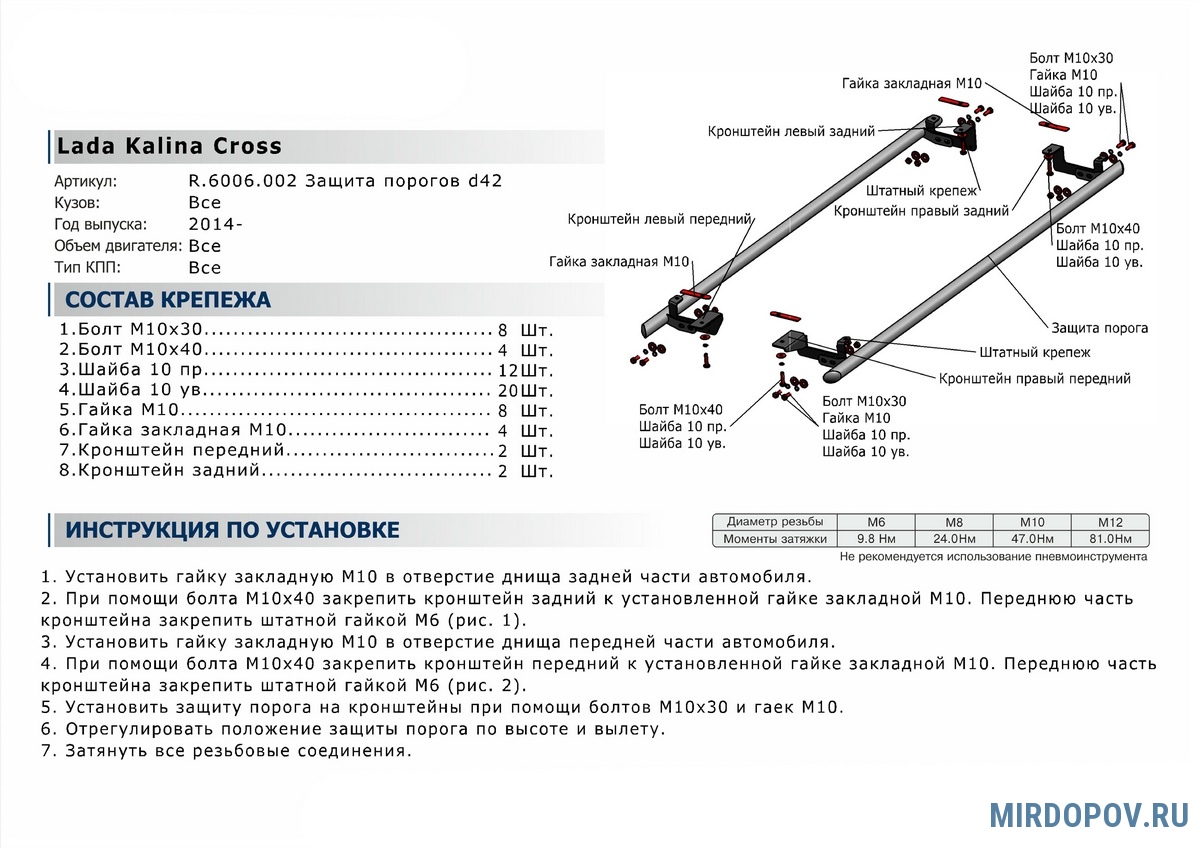 - Простота установки за счет точного совпадения штатных отверстий с элементами крепежа защиты.