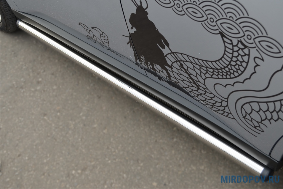 Пороги Russtal представляют собой накладки, выполненные в форме труб, которые создаются специально для конкретной модели автомобиля. В своем производстве специалисты ведущей российской компании используют полированную нержавеющую сталь итальянского производства. Данный материал отличается стойкостью к образованию коррозии, не боится механических и ударных нагрузок, сохраняет первоначальные качества и внешний вид на протяжении всего периода эксплуатации.