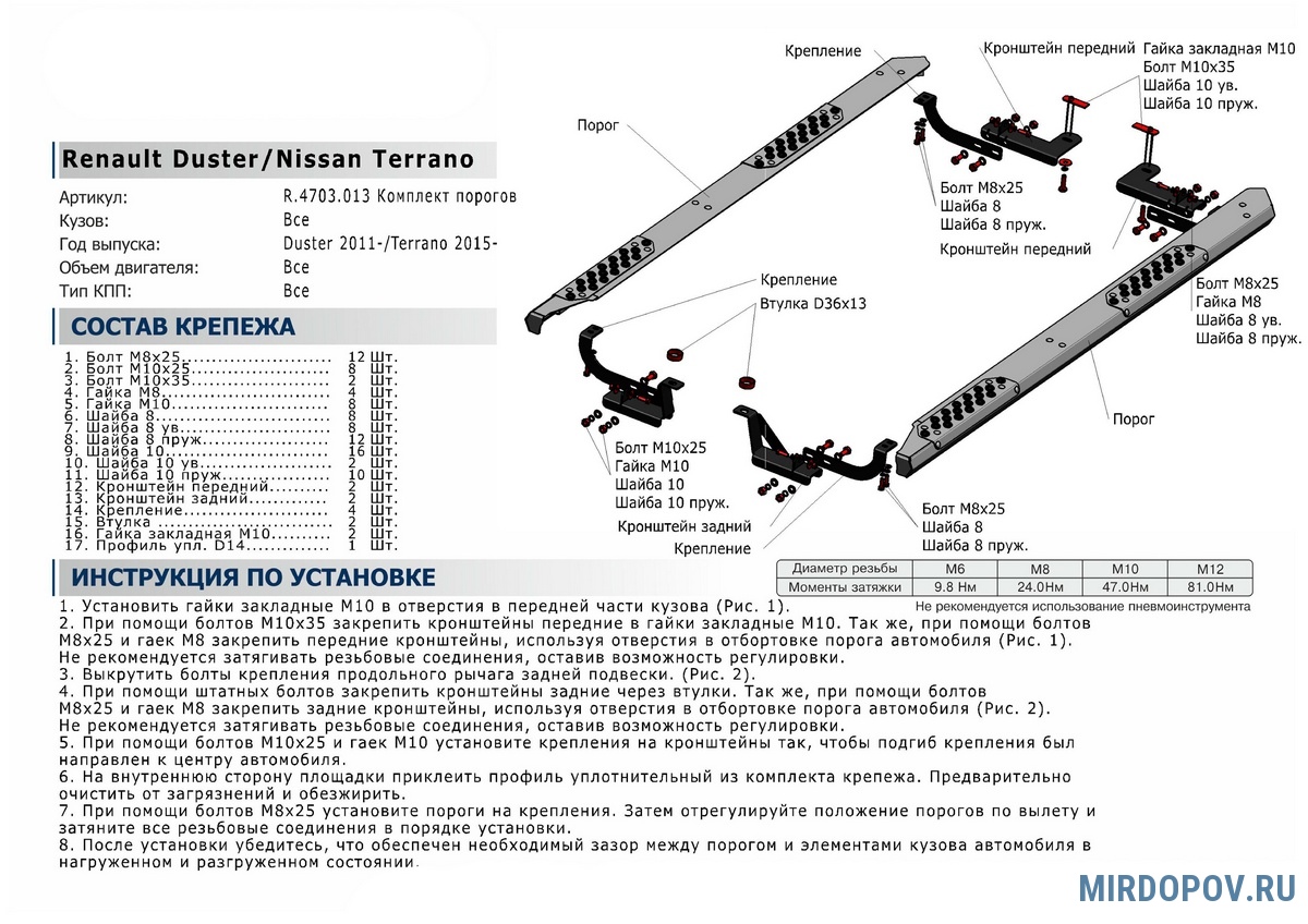 - Простота установки за счет точного совпадения штатных отверстий с элементами крепежа защиты.