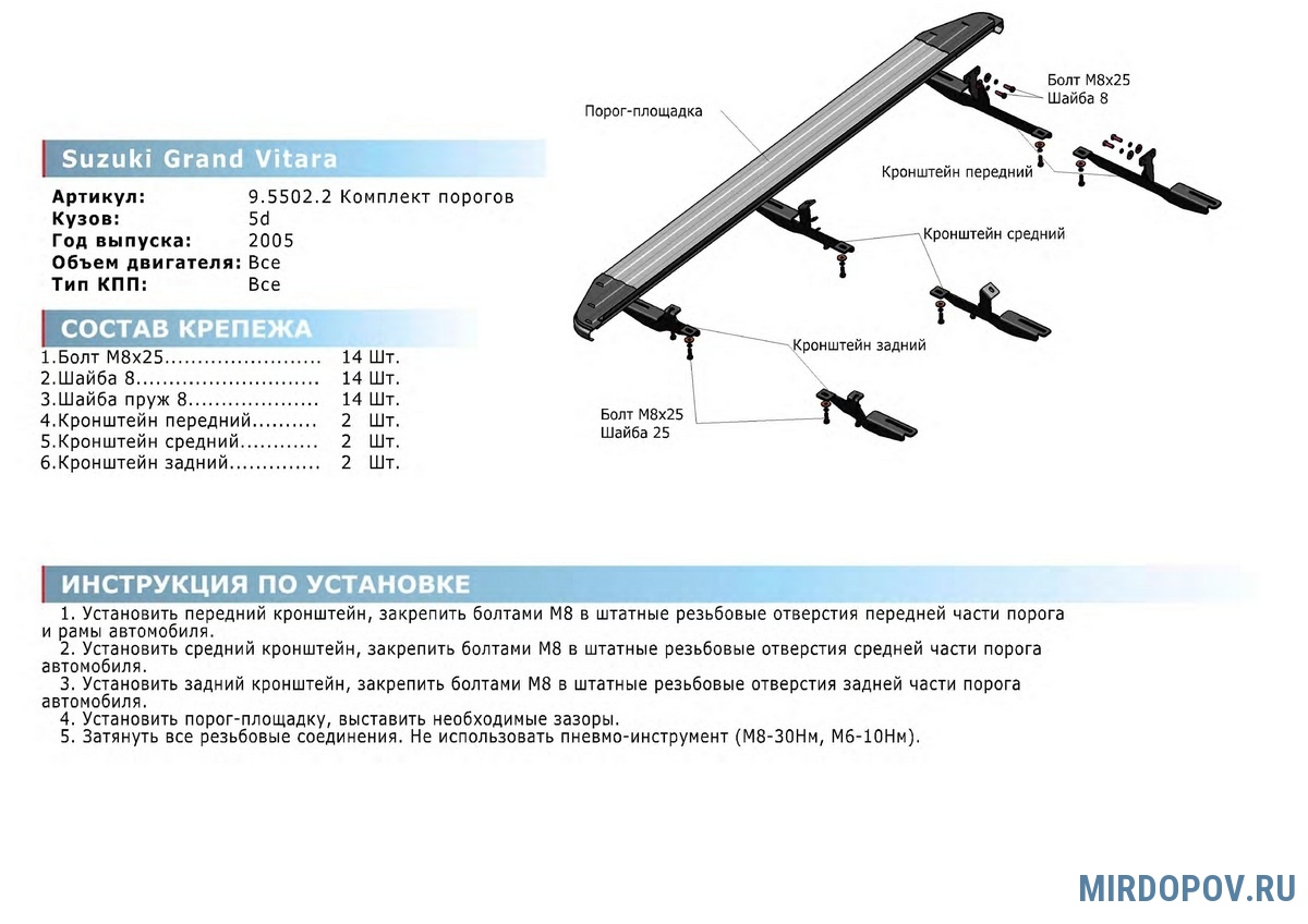 - Простота установки за счет точного совпадения штатных отверстий с элементами крепежа защиты.