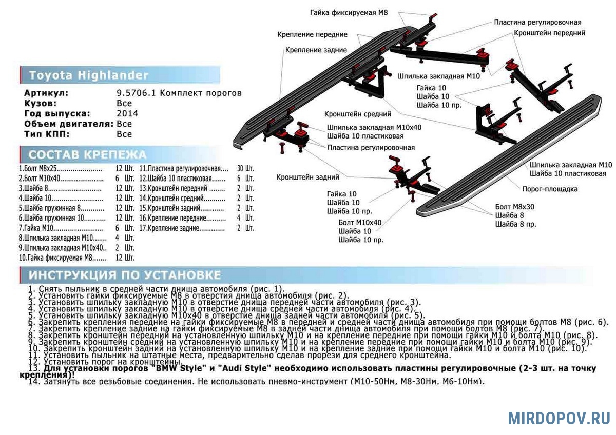 | Установка порогов (комплект) | от 4500 руб. |