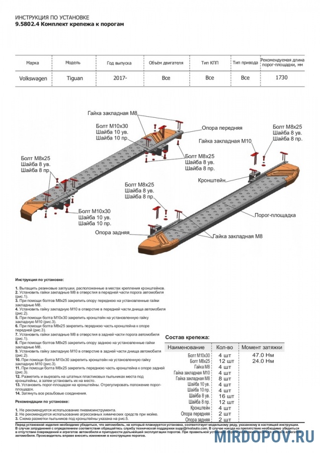 - Простота установки за счет точного совпадения штатных отверстий с элементами крепежа защиты.
