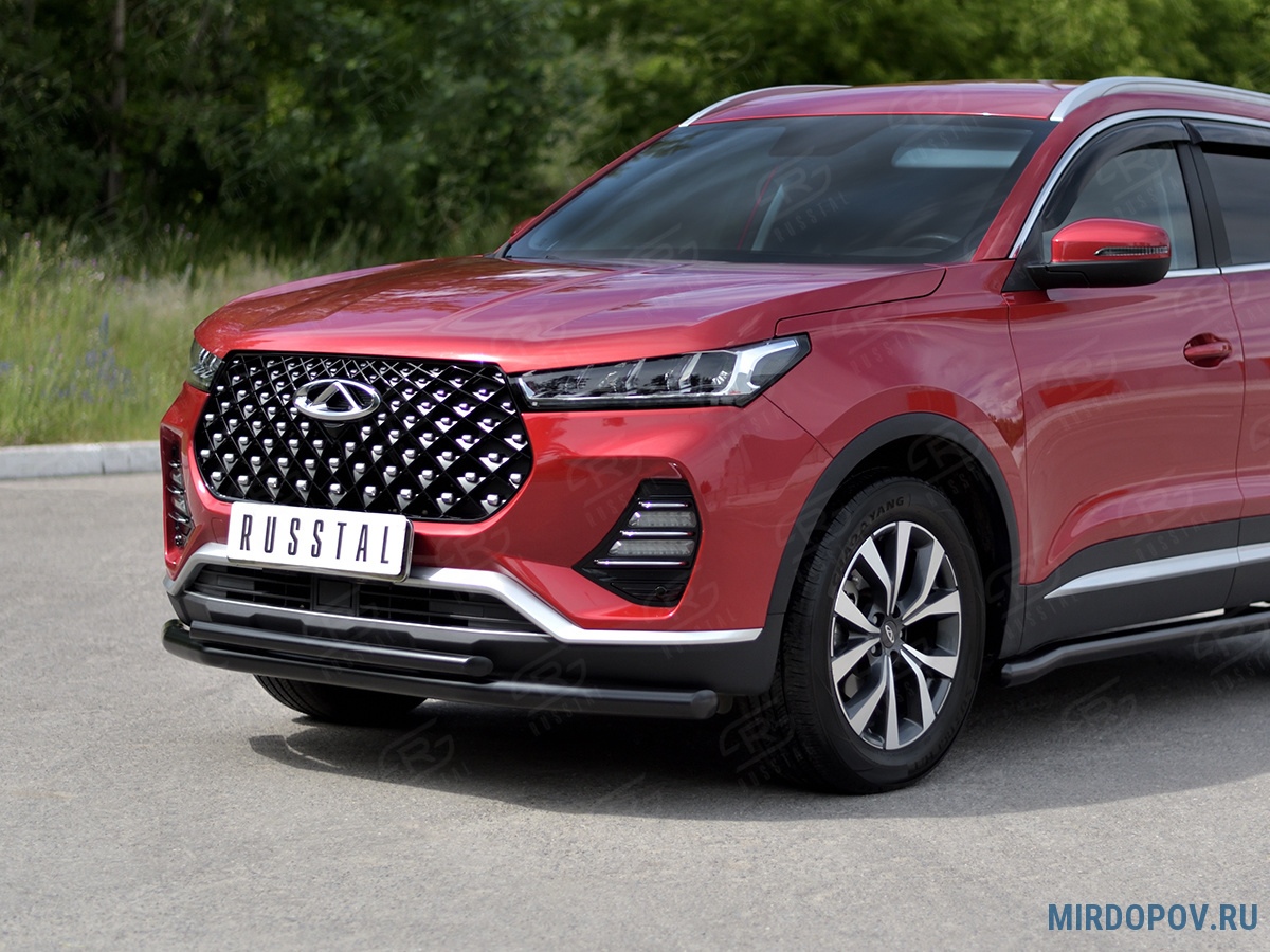 Защита переднего бампера d63 секции - d42 дуга с черным полимерным покрытием RUSSTAL для Chery Tiggo 7 Pro (2020-2023) № CHT7Z-003873CH